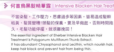 主要成份:上等何首烏、人蔘、迷迭香等精華元素、維他命B5。